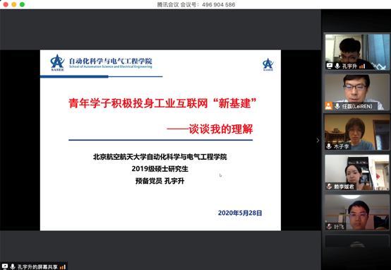 结合《2020年国务院政府工作报告》提出的“千方百计稳定和扩大就业”精神,自动化学院系统仿真与智慧制造系党支部与系内25名研究生进行了在线研讨。孔宇升同学作为预备党员,同时作为上述两会特别节目的青年学生代表,以《青年学子积极投身工业互联网“新基建”》为主题发表了见解,提出根据两会会议精神,作为青年学子应立足北航特色、顺应国家战略发展需求,力争在其所从事的工业互联网研究方向做出创新性贡献,成为国家未来需要的栋梁之才。