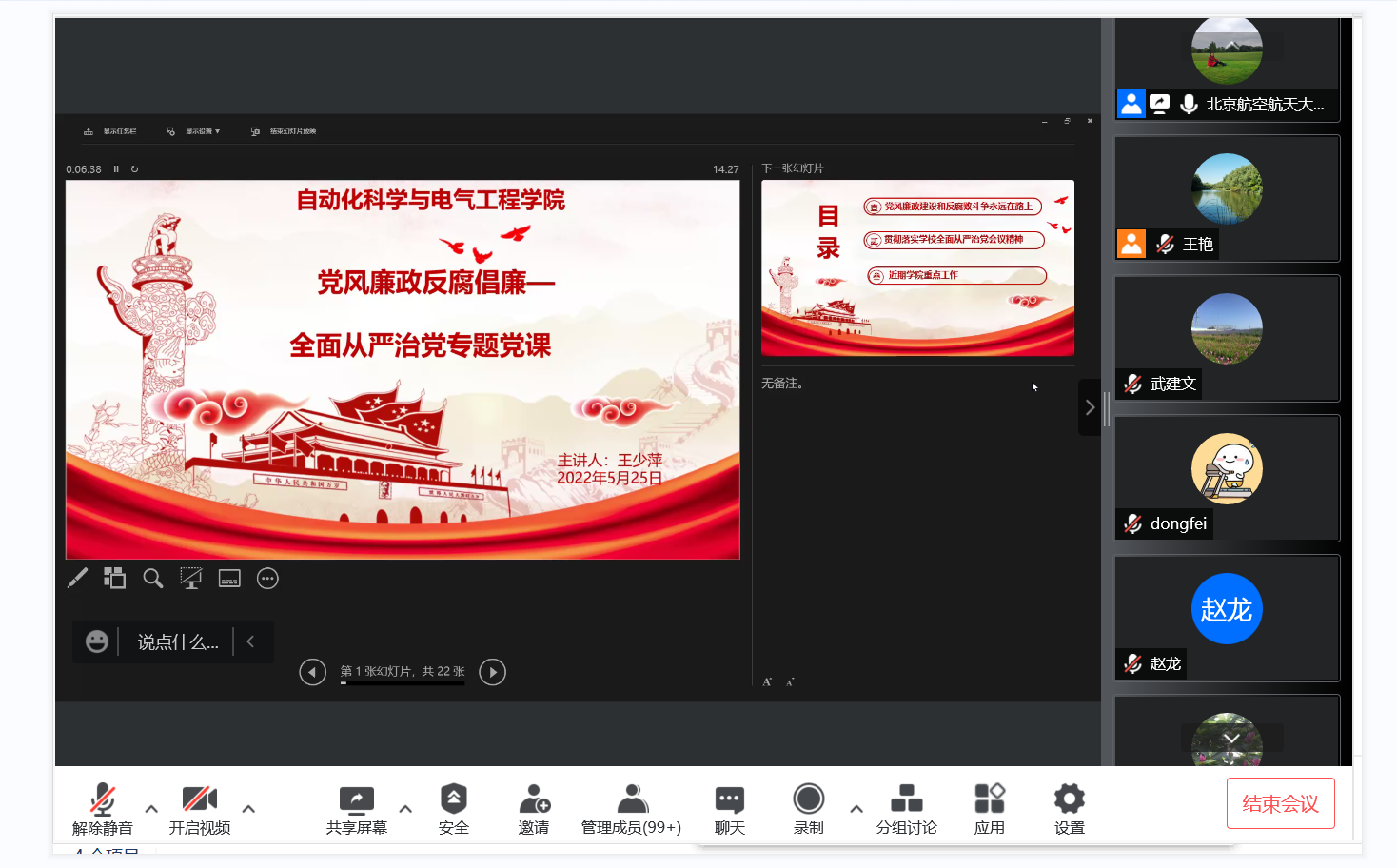 2022年5月25日76net必赢线路检测中心党委书记王少萍做了“从严治党暨党风廉政建设”专题党课。会议以线上腾讯视频会议方式进行,学院全体教职工参加了本次集体学习活动。