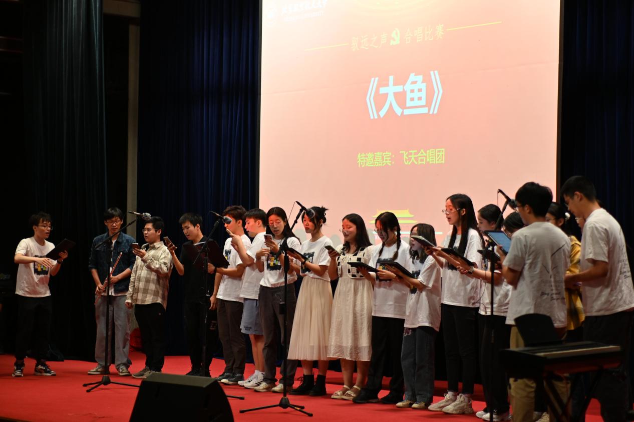 参赛班级进行演唱赛程告一段落后,学院飞天合唱团作为此次比赛的特邀嘉宾,为大家带来了合唱《大鱼》和笛子独奏《红蜻蜓》。这不仅仅是音乐的展演,更是一场跨越时空的情感交流,所有观众为之沉醉与感动。在登台的合唱团成员中,多数都担任了本次比赛的指导老师,负责班级曲目的指导和编排。他们用自己的热爱和努力帮助每一个班级“从零起步”,让更多同学了解合唱,爱上合唱。